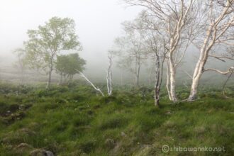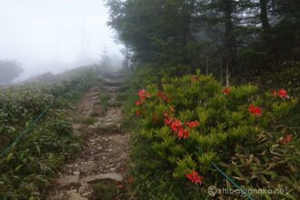 王ヶ頭までの登山道は、霧とレンゲツツジと笹原が重なっていい雰囲気。