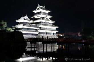 下界に下りると、鏡面のように映る松本城のライトアップが綺麗でした。