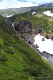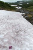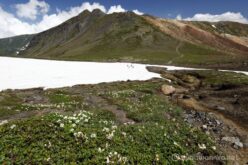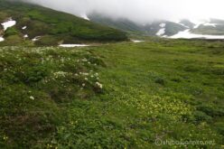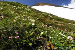 雪渓が融けたばかりの雪渓の脇では、多様な高山植物が咲き乱れ。