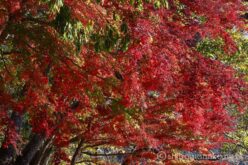 紅葉の絨毯を踏みしめながら紅葉の大木の裏に回ると、紅葉が朝日に透ける。