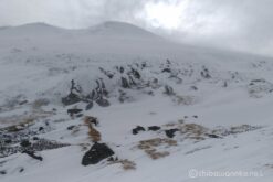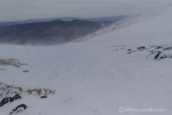 残りの体力も心もとないので、爆風の中スキー装備を整えて下山開始。