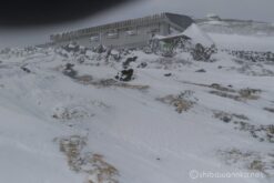 強風に逆らいながらやっと到着した肩の小屋は、強風が吹き荒れていた。