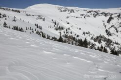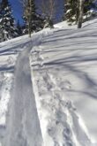 登りは降雪直後で滑らかで綺麗だった雪面も、多くのトレースでグサグサ。