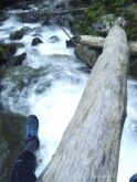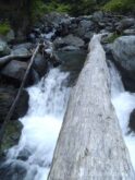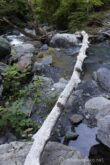 1時間半ほど林道歩きと沢沿いをゆるゆる進むと、広河原に到着する。渡渉ポイントに、例の丸木橋が引っかかっている。誰がこんなに上手に丸木橋をかけてくれたのでしょう?