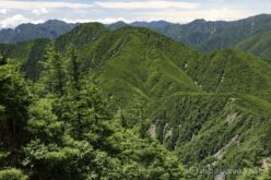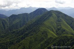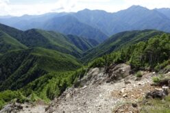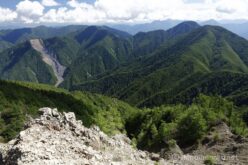 布引岳の崩壊地から、最後に深南部の山並みを眺める。ここより南にもう高い山はないかと思いきや、巨大な山塊が見える。この前登った大無間山か。