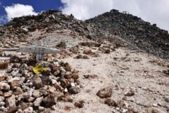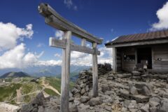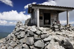 肩の小屋から乗鞍岳山頂まで40分。ヒルクライムで脚を使ったのか、それなりにしんどい。冬山登山の重装備に比べれば、空気のように軽い装備しか持っていないのに、ゴロゴロした石が歩きづらく、冬の乗鞍岳の方が登りやすいのではないか?とか思ってしまう。ようやく山頂を捉えた。あともう少し。