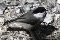 肩の小屋でしばし休憩。足元にいた小鳥がストックにとまった。調子が悪いようで、うまく飛べずこの距離でも逃げて行かない。頑張って回復してほしい。