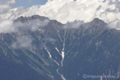 ちょうど雲から姿を現す穂高連峰。奥穂高。多くの登山者で賑わっているのでしょう。望遠レンズでもさすがに人は見えない。