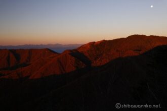 尾根尾根の向こうに富士山が構える。なかなかバランスの良い構図だ。富士の撮影スポットで有名なのもうなずける。三つ峠が真正面に見えるのね。目的通り、綺麗に焼けた富士を撮ることができた。