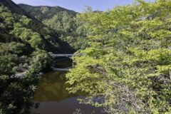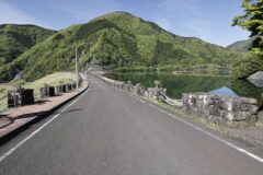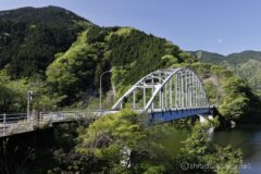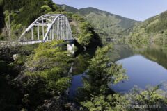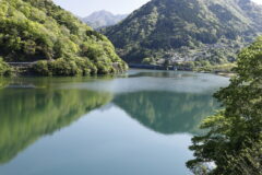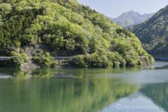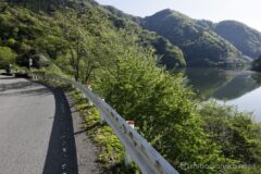 三保ダムまで到達すれば一安心。鏡面になった湖面に永歳橋と新緑の山並みが映り込んで美しい。今日は朝早く来てよかった。広いダムの堤体を走って、県道76号線に合流。