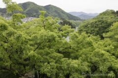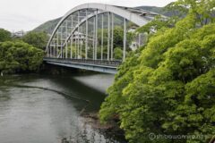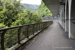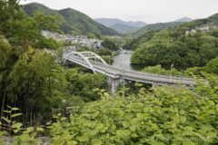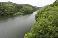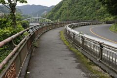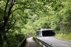 国道412号線は、中央高速相模湖ICへ頻繁にアクセスしている道。まさかこの道を自転車で走ることになるとは。相模湖が近づいてくると、車道は狭い一方で歩道は立派に広く走りやすい。そして車で走っているとお馴染みの、側面に半円窓がたくさん並ぶ嵐山同門に差し掛かる。新緑の森の中に、ポッカリ口を開けているよう。湖面の奥には、ランドマーク的なアーチ構造の相模湖大橋と相模ダムが続く。