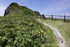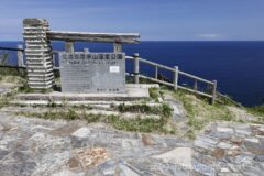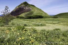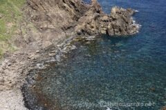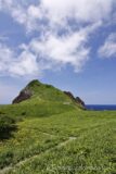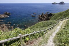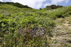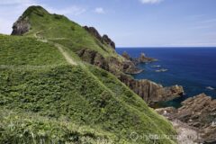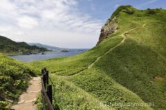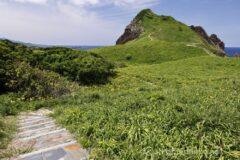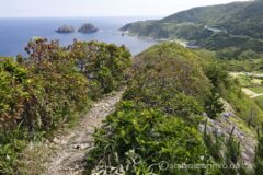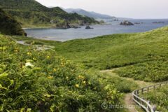 青い海を正面に見ながら、もう一度トビシマカンゾウが密生するポイントへ。振り向けば、日本海から立ち上がる大野亀。複雑な海岸線が美しい。