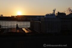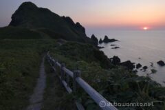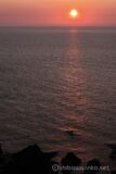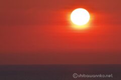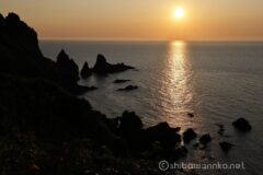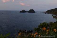 夕日が水平線に沈む。トビシマカンゾウと二ツ亀。上空の雲が焼ける。