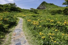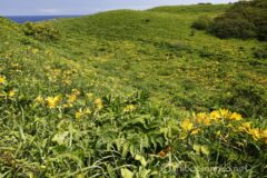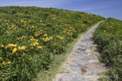 トビシマカンゾウと青空。この景色が見たかったんだ。一足早い6月から、黄色のニッコウキスゲ(ほぼ同種)が見れるなんて。当たり年ではないかもしれないけれど、この条件のよいときに、しっかり撮っておこう。