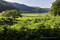 十分標高を上げると、展望が開けるスポットがあり。そこからは先ほど走った湖畔のルートの奥に、棚田が長く続くのが見える。