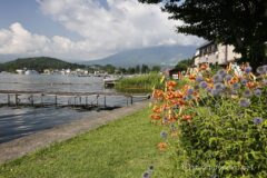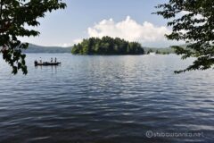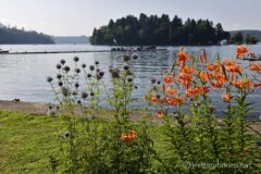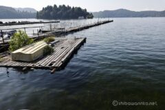峠を下りれば、雲を盛大に被った黒姫山。今日の山は早朝勝負だった模様。湖には琵琶島が浮く。湖畔にはユリが咲く。山でもサイクリングでも花が彩を添えてくれると嬉しい。琵琶島には船着場があり、遊覧船が行き来する。