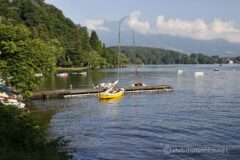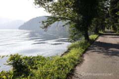 森を抜けると、湖面すぐに木々が並ぶ気持ちの良い湖畔ロード。これはサイクリングにうってつけの道だ。湖面がすぐそばで、車通りも少なくゆったり湖を見ながら走れる。