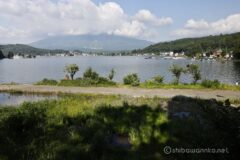 夏の日差しをギラギラ反射する湖面を見ながら、左回りで回る。すぐに別荘が並ぶ森の中に入る。所々湖面が見え隠れ。湖面の向こうには斑尾山。昔よくこんな遠いところまで、冬山とスキーをしに来たものだ。