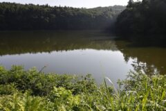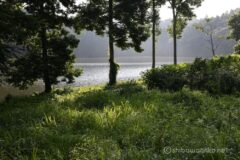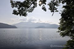 うす暗い林間コースを抜けると、野尻湖の東端に到達。ダウンヒルすると湖畔まで下りられる。湖と山の景色が広がり、ここからの景色もなかなかいい。右には妙高、左には黒姫山。残念だけどもう雲が盛大にかかっちゃってるね。今日鹿島槍ヶ岳に登っていたら、夜明け山頂計画でギリギリ間に合っただろうか。