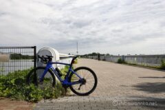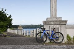 08:30 先に周回終わった狭山湖の終点、狭山湖堰堤南端の公園が、多摩湖周回のスタート。今度は、第一取水塔が背景に写るアングルで記念写真。うかうかすると、サイクリングで自転車が写っている写真を撮り損ねることが多いので、これぞと思うスポットがあった場合は、後回しにしないで撮っておくことにしています。そして、第一取水塔の背景に見える高そうな山は何でしょうか。奥多摩のどこかの山だと思うのですが。