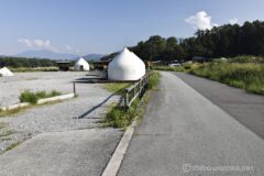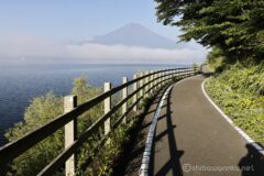 いったん小さな湾を回りこむように山中湖みさきキャンプ場に近づくと富士山は見えなくなるが、キャンプ場を通過して再び湖岸に出れば、サイクリングロードの奥にドーンと富士山が現れてくる。この瞬間はいつもテンションが上がる。富士山をこれだけ近く見ながら走れる山中湖のサイクリングロードって、本当に最高だと思う。