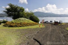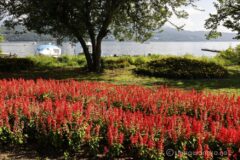 少し森の中に入って湖岸に下りられる道を下りると、ここにもお花畑あり。こんもり小山がお花で埋め尽くされている。これは富士山を模したものだろうか、と見るたびに思ってしまう。真っ赤なサルビアの向こうには面白い魚の漁船と湖。