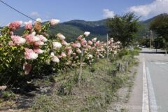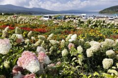 07:00 山中湖の東岸、平野の浜からスタート。山中湖の平野の浜には花壇が作られており、毎年お花を楽しませてくれる。ピンクから白へ変わるグラデーションの細長いアジサイのような花が綺麗なのだけれど、花の名前が分からない。