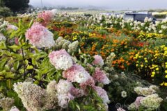 平野の浜まで戻れば、名前の分からないピンクと白のグラデーションのお花がいっぱい。朝と違って霧が晴れて花が輝いている。ここにきて最後にお花撮影。