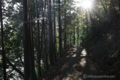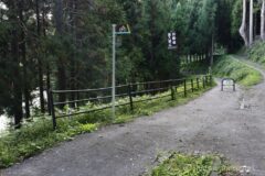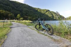 県道324号線から中綱湖の北岸に入ると、自動車進入禁止の森の中の細いサイクリングロードになる。木々の間から中綱湖が見え隠れ。幅は広くはないのでスピードを出すことはできないけれど、車が入らないので、ゆっくりサイクリングするのにぴったしの道だ。