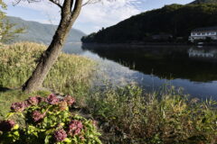 仁科三湖サイクリングは、メインの鹿島槍ヶ岳登山のついでなので、あまり下調べをしていない。木崎湖園地にあった木崎湖周辺案内図を見て、湖周辺の見どころを頭に入れる。木崎湖園地からは、秋の晴天の下、朝の綺麗な湖の風景が広がる。なんとまだアジサイが咲いている。