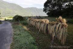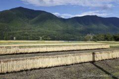 稲尾崎エリアの端まで来たら、小川に沿って鋭角的に稲尾駅方面へ戻る。木崎湖方面を見れば、天日干しされた稲穂の向こうに、前衛の山の端から少しだけ頭を出す北アルプス高山の峰。なんでしょうね?あのピークは。部分的すぎてなんの山かよく分からない。w