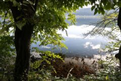 反時計回りで、湖すぐそばの湖畔散策路を進んでいく。風がないのか、湖が鏡面になりかけている。