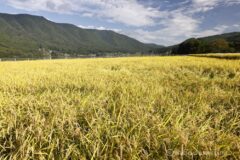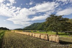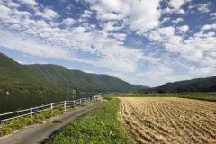 コスモス畑を過ぎると、既に刈り取られているが、一面の田園地帯へ。上空には秋雲が流れ、こんな湖すぐ脇の田んぼエリアを走れるなんて、木崎湖サイクリング、なかなか素晴らしい!