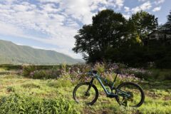 まだ朝早く、コスモス畑に日が当たっていない。このコスモス畑が今日の木崎湖一周サイクリングでよい撮影ポイントとなりそうだったので、日が回ってくるまでしばらく待つことに。その間に木崎湖と電動MTB(以下「ザク」)の記念写真。昨日の鹿島槍ヶ岳登山と中綱湖・青木湖サイクリングと、よく活躍してくれている。