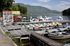 08:50 湖と言えばボート。ボートがたくさん係留されているモダンボートを通って、木崎湖一周サイクリング完了。よく見ると、白鳥ボートに混じって、3匹ほど変なのが混じってるな。w