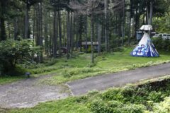 西岸は林間コースで、ひっそり静か。ところどころにキャンプ場が点在する。木崎湖POWPOWキャンプ場には変わったテントがあり。