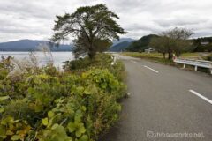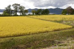 樹林帯から出ると、湖畔にたわわにお米が実った黄金色の田んぼが現れる。いいね!田んぼに湖面と遠くの山並みが入って、なかなか良い景色。残念なことに白浜では一瞬晴れてくれたものの、完全に曇り空になってしまった。光が当たっていたらもっと綺麗だっただろう。