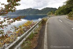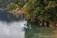 たつこ像の隣には、湖に張り出すようにお堂、漢槎宮が建っている。このたつこ像エリアもよい雰囲気。たつこ像と御座石神社が田沢湖の二大お立ち寄りスポットだろうか。寄るとこ寄ったので、後は急いで戻るだけ。たつこ像からの湖下半分を激走する。