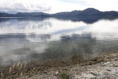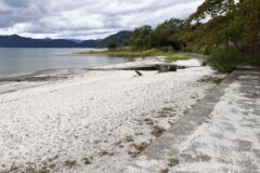 12:30 素早く昼食を食べてから、田沢湖レンタサイクル付近から田沢湖一周スタート。まずは湖畔に下りると白浜になっていて、いきなし綺麗。ちょうど太陽の日差しで砂浜が白く輝いている。こんな白浜からは、水深が423mもある日本一の深さがある湖とは思えない。雲が多い天気だけどあと1時間くらい、たつこ像に到達するまでは、どうにか晴れていて欲しい。