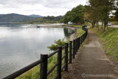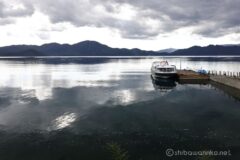 下りで乗せたスピードを維持したまま走ると、すぐにスタート地点。先ほど御座石神社の鳥居まで遊覧しに来ていた遊覧船が、乗り場まで戻ってきていた。晴れそうで晴れない。湖は青くは輝いてくれなかった。
