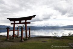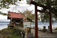 北岸まで来ると、湖畔に立つ御座石神社の鳥居が見え始める。いいねいいね、これは絵になる。琵琶湖でいったら白髭神社みたいな感じだ。白髭神社と違って、こちらは水に浸かってないけど。w