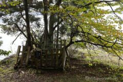 続いて雨乞石。案内版には、「七種木のある柵の中に、高さ1m程の石がある。この石を動かすと湖が荒れ、雷、風、雨になると言われ、昔から湖神を祀った石と言われている」とのこと。頼むから今この石を動かさないでくれ。嵐のサイクリングなんて最低だから。w