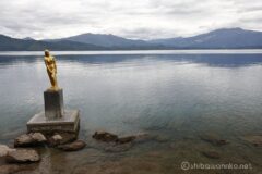 次のお立ち寄りスポットは、有名なたつこ像。田沢湖で一番有名なのではないだろうか。実は3回目。相変わらずキンキラキンのたつこ像が湖のほとりに立っている。光があれば真っ青な湖に映えるんだけれど、今日は残念ながらの曇り空。それでも昔、友人たちをたつこ像に案内した楽しい記憶を思い出してしまう。