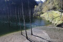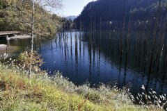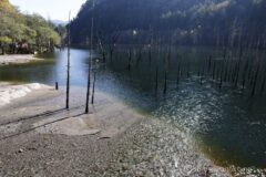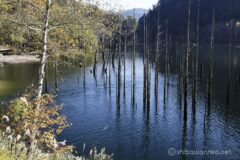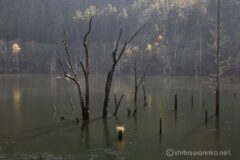 自然湖は、どす暗い湖面から黒い枯れ木が突き出ている。あれ、こんな感じだったけかな?光線状態の問題かな?