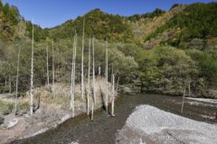 手前の斜面に紅葉の木が残っていてくれたので、逆光で輝かせるといい感じに。今日のこの状況下ではこれがベストかな。上流側を見ると、立ち枯れた白い木々と紅葉の斜面と青空。