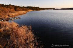 16:40 1時間10分でスタート地点のかっぱの小径に到着。まだ残照が残っているので、しぶとく夕景狙を狙う。かっぱの小径を歩いて牛久沼まで下りていく。なんだこりゃ?牛久沼にゴルフボールに穴の開いたようなものが2つ浮いているではないか。