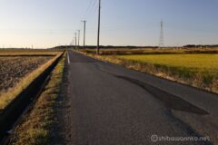 ダートトラップに引っかかって時間ロス。もう1回引っかかったら、一周する前に日没を迎えてしまうだろう。牛久沼から離れて、安全に舗装路を選択する。広い田んぼの中を走る道に出た。ここは景色を楽しみながら出力を上げて激走する。もう少しで日が暮れてしまいそうだ。