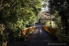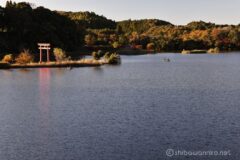 亀山湖の東岸は、木々に覆われた鬱蒼とした道が続き、展望はあまりよくはない。しかしときおり、木々の合間から湖に浮かぶ亀山水天宮鳥居が見え始める。