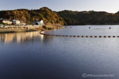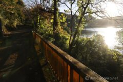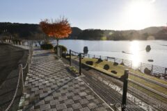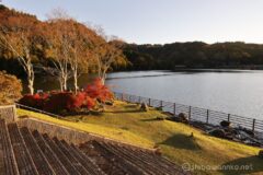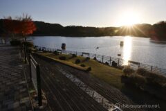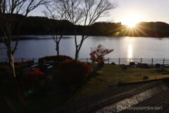 16:00 亀山湖の西岸に夕日が沈む。紅葉を配したけど逆光でやや潰れてしまった。今日は天気にも恵まれ、紅葉の8つの湖や池を回れてよかった。亀山湖はまた新緑の時期にでも訪れてみたい。