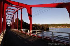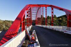 地図を見るとさらに西側の亀山2号橋まで行って大回りできるけど、時間がないのでこの辺りで湖一周を完結させよう。押込橋からは、赤い亀山水天宮鳥居と赤い川俣大橋が見える。そしてこれから渡る橋も赤いアーチ橋。どうやら亀山湖にかかる橋は赤で統一されているようだ。